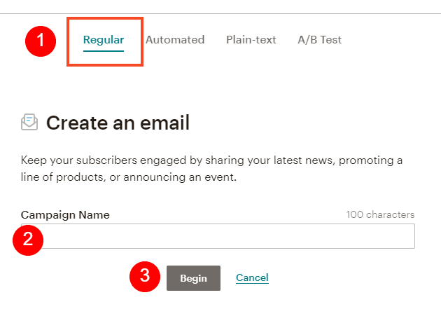 Type a Campaign Name (subscribers won’t see this) and then press “Begin”.