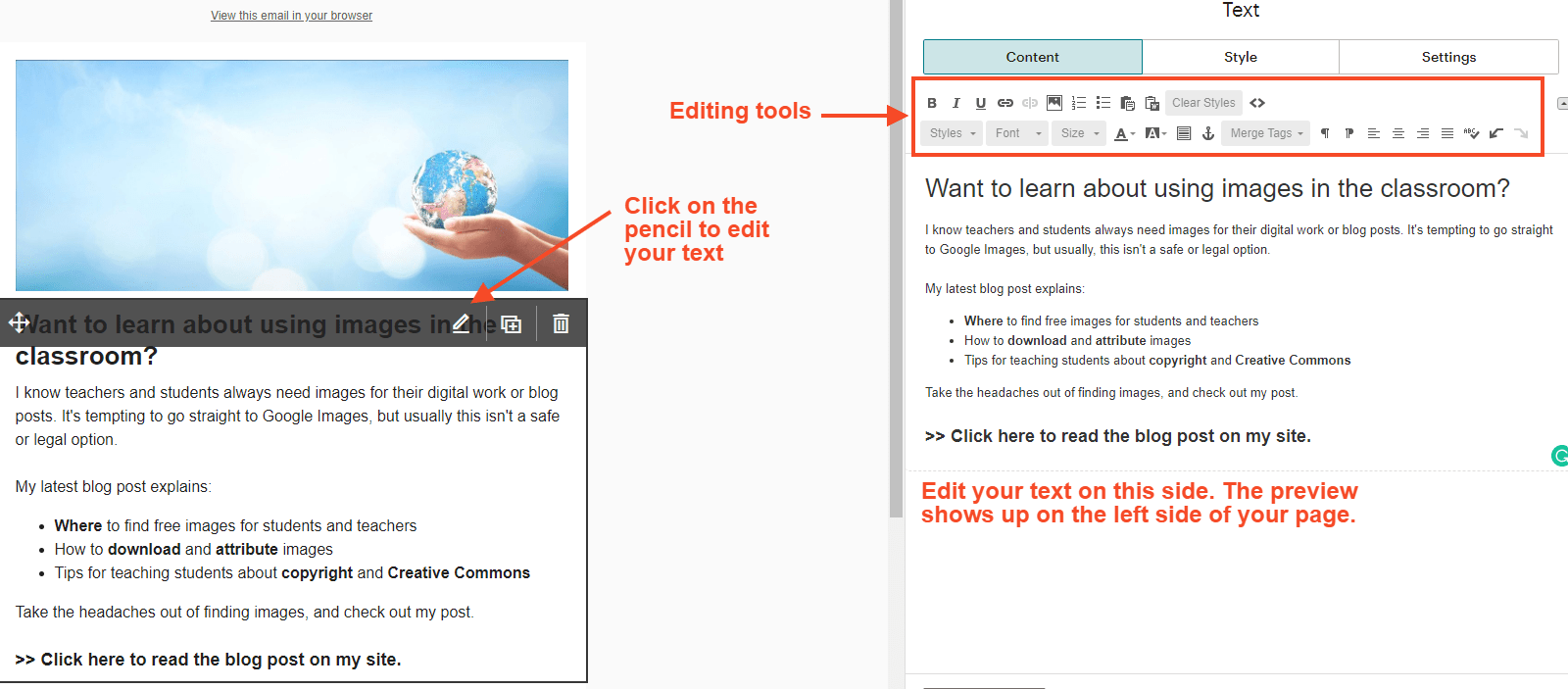 Hover over the block of text and click on the pencil icon. You’ll write the text of your newsletter on the right-hand side using the familiar editing tools to format (bold, italics, link etc.).