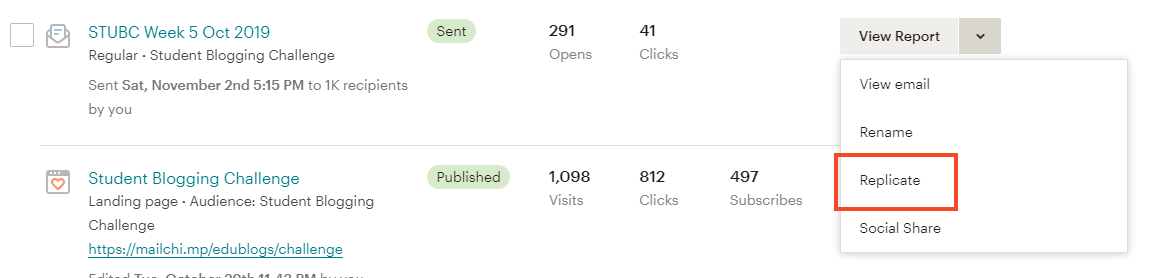 - Click the drop-down menu for the campaign you want to copy and select Replicate.