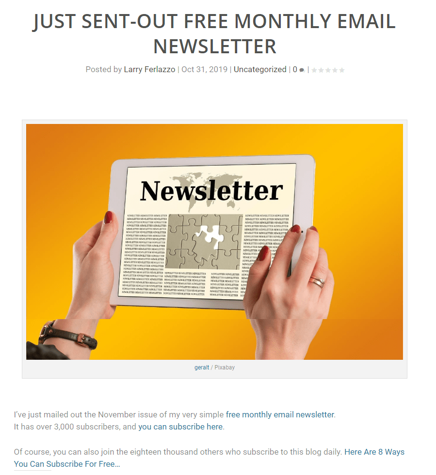 - You can also write a blog post to tell readers about your email lists. Here’s an example from Larry Ferlazzo. He includes a link to read his latest newsletter online.