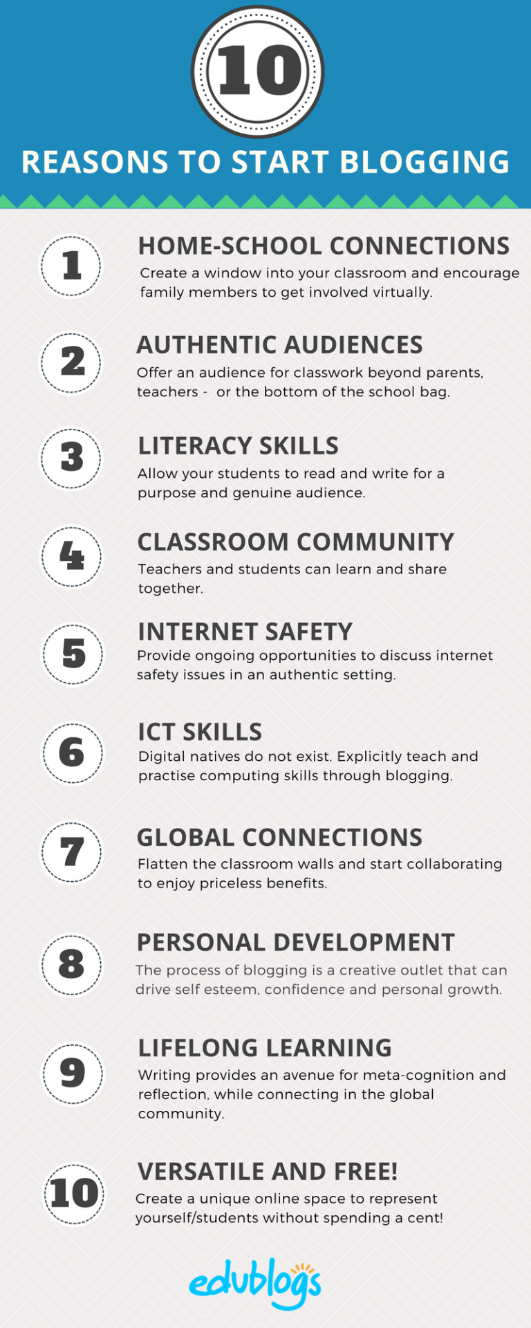 Here are ten reasons why you should integrate blogging into your classroom or professional practice. And be sure to read to the very end for a summary infographic that you can share!