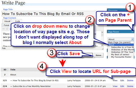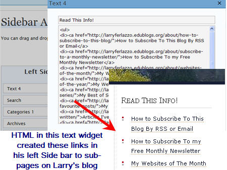 I used HTML code for hyperlinks to create a text widget that linked to pages on Larry’s blog which allowed me to reduce the number of pages at the top of his blog (refer to Tips for Blog Makeovers for the reasons why).