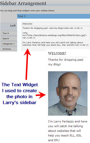 As Kate Olsen highlighted, if you use your photo for your blog avatar, a simple alternative is to add the Avatar Widget to your side bar (learn more about Widgets here!). However with Larry’s “blog makeover” I wanted to add words above and below his sidebar photo which is why I used HTML.