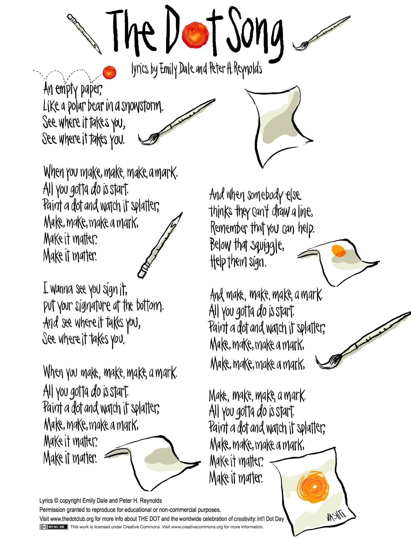 These lyrics are for a song that Peter H. Reynolds and Emily Arrow wrote for International Dot Day. Find the video and actions here.