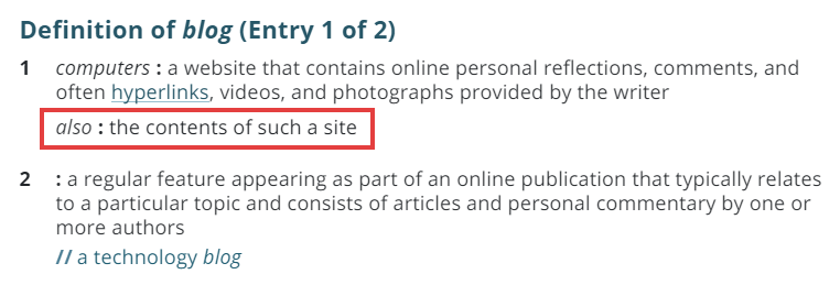 I know language does evolve and maybe the noun blog has evolved to have a dual meaning.