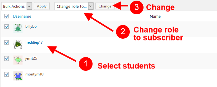 - Go to the Dashboard of the student blog on the Users Tab. Select the student’s username and click on Change role to … Subscriber. Press Change.