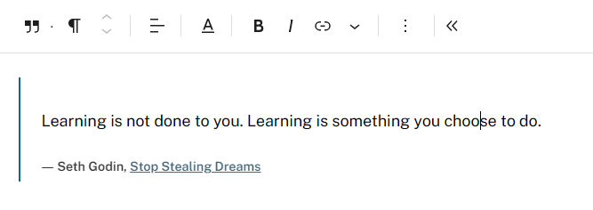 The quote block comes with the standard editing options: alignment, bold, italicize, hyperlinks, and strikethrough.