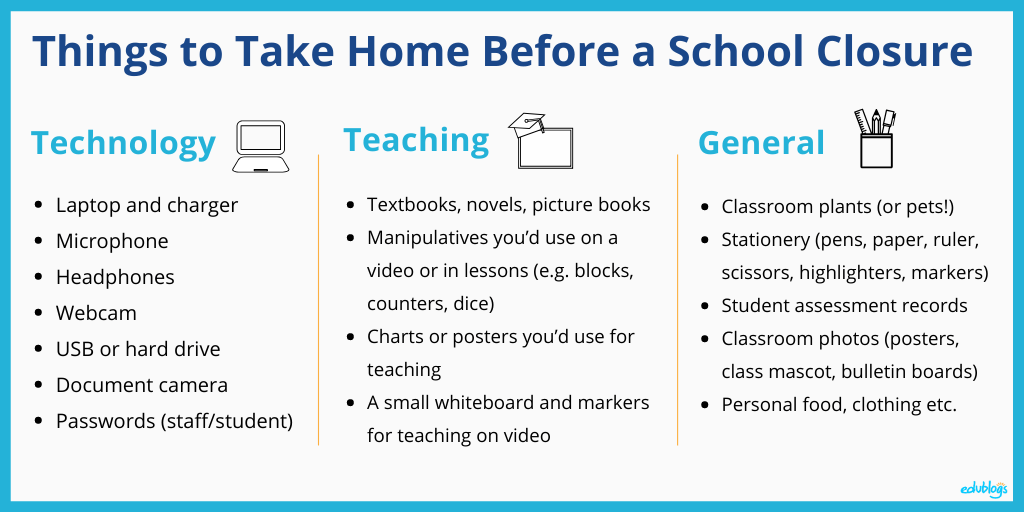 Things to take home: Your laptop and charger Headphones, microphone, webcam (if you have them) Document camera Textbooks, novels, picture books Manipulatives you’d use on a video (e.g. blocks, counters, dice) Charts or posters you’d use on a video A small whiteboard and markers for teaching on video Copies of passwords (teacher and students) Classroom plants (or pets!) General stationery (pens, paper, ruler, scissors, highlighters, markers etc.) Student assessment records (if not digital) Photos of anything in the classroom that you might be able to use (posters, class mascot, bulletin boards etc.)