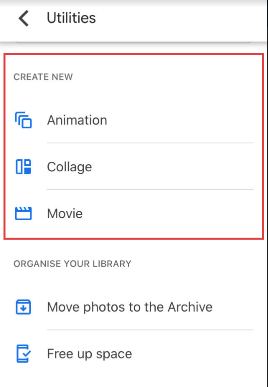 - At the bottom of the Google Photos app, tap Library and then Utilities.